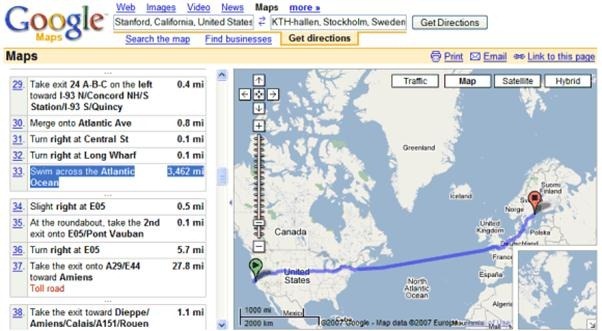 Top image via Googlesystem. The map shows strange directions - if you want to go from Stanford [USA] to Stockholm [Sweden], Google recommends to "swim across the Atlantic Ocean" (only 3,462 miles)!!!